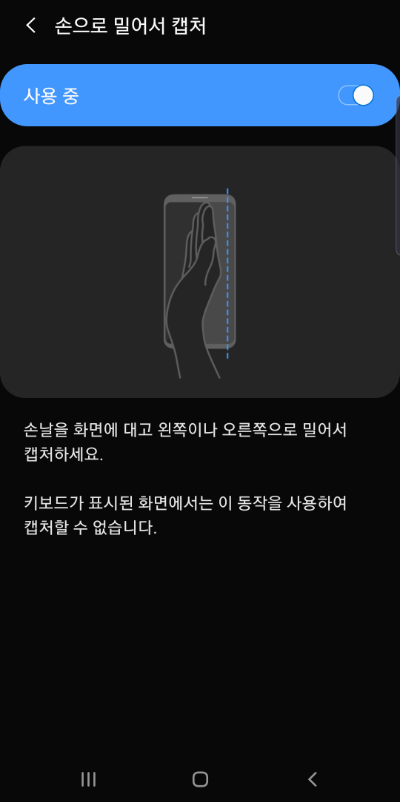 갤럭시 핸드폰에서 두번째로 자주 사용하는 방식이 아닐까 생각하는데요. 모니터를 기준으로 손바닥을 세로로 세운 상태에서 손바닥의 손날로 화면을 좌측에서 우측으로 가볍게 밀어주면 캡쳐가 됩니다. 물론 캡쳐를 시작하는 부분은 우측에서 좌측으로 밀어줘도 캡쳐가 되고, 좌측에서 우측으로 밀어주더라도 캡쳐가 가능합니다.
