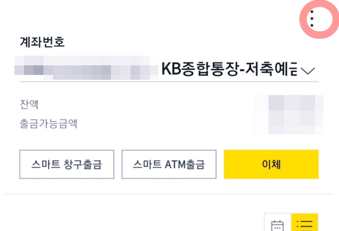 상단 우측에 점 세 개를 터치해 주시면 메뉴 선택이 나오게 되는데 메뉴 선택에는 계좌 정보, 월간 분석, 모바일 통장, 통장 전환, 통장 사본 보기 등 다양한 메뉴가 나와 있습니다.