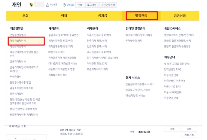 SMS 서비스, 출금 계좌 등록 및 삭제 등 다양한 메뉴가 있는데 그중에서 계좌개설 확인서를 클릭해 주세요.