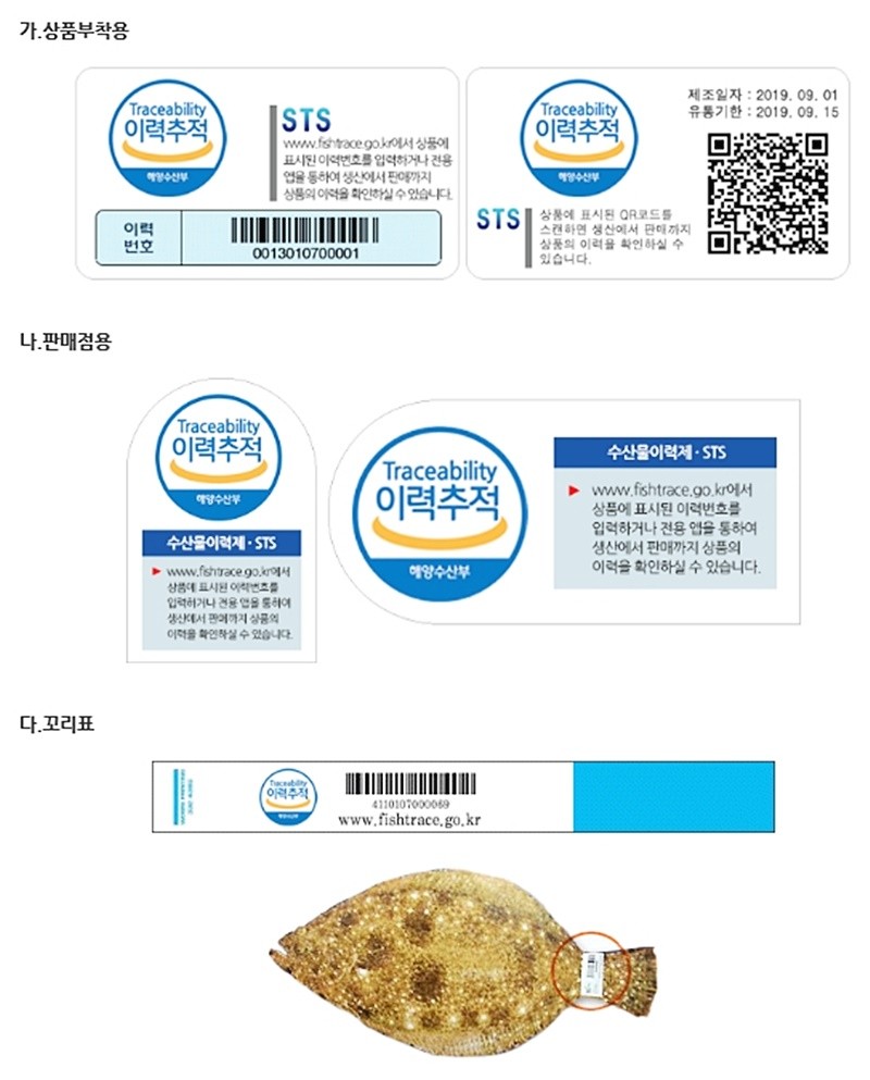 수산물이력제 는 총 세 가지 형태로 만나볼 수 있는데요, 수산식품 위에 부착된 스티커나 판매점용 스티커, 혹은 수산식품의 꼬리에 부착된 꼬리표를 찾아보시면 됩니다! 이 스티커나 꼬리표에 적혀있는 13자리 이력 번호가 바로 핵심인데요, 이 번호를 확인하면 수산물의 전 유통과정을 확인할 수 있답니다.
