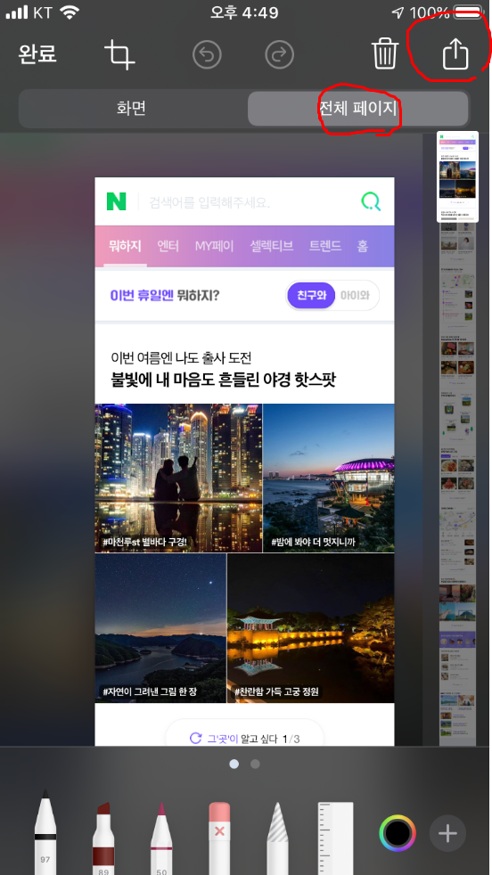 사용하는 방법은 위와 같이 화면을 캡쳐를 하게되면 상단의 모습처럼 전체페이지이콘이 표기되는 것을 볼 수가 있습니다. 그러면 해당 전체화면을 선택한 이후 우측 상단에 있는 전달하기 이미지를 선택하셔서 다른 사람에게 전달하기로 보내시면 됩니다.