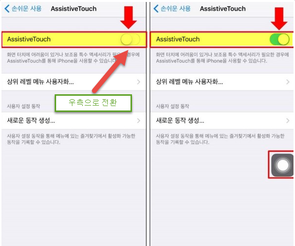 설정 → 손쉬운 사용 → 터치 → Assistive Touch를 활성화한 이후 사용자의 편의성에 따라서