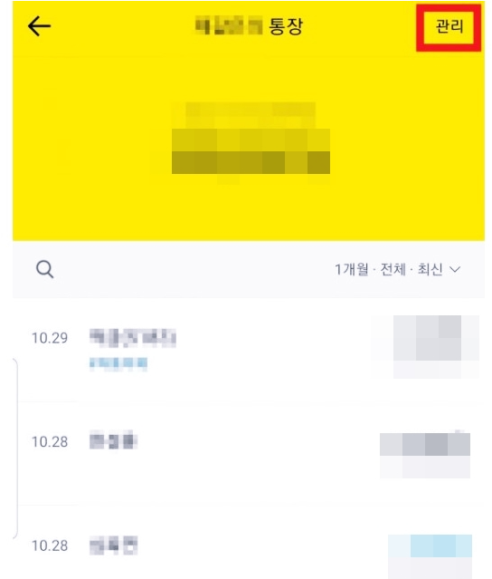 선택을 하게 되면, 통장 잔액이 표시가 되며, 계좌 정보가 나오게 되는데 우측에 관리 메뉴를 확인해 보실 수 있습니다.