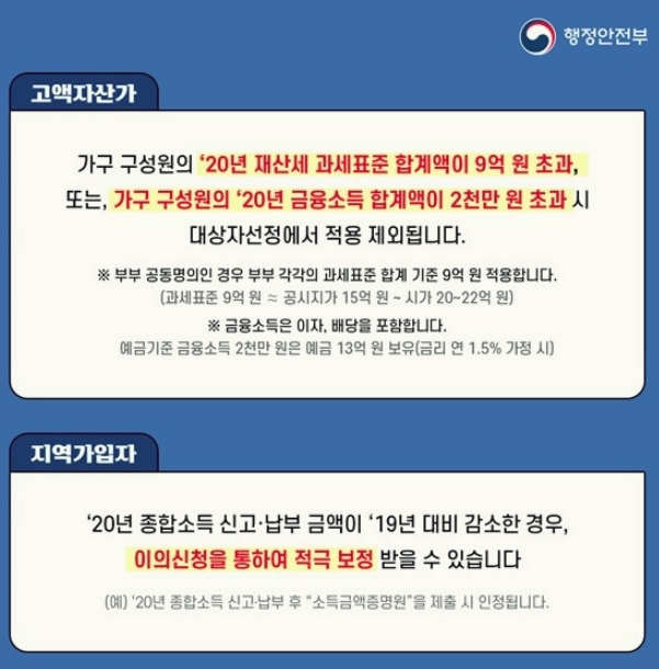 그렇지만, 가구 구성원의 20년 재산세 과세표준 합계액이 9억 원 초과, 또는 가구 구성원의 20년 금융 소득 합계액이 2,000만 원을 초과하는 고액 자산가분들은 해당 지원금 대상자 선정에서 제외가 되며, 부부 공동 명의의 경우 부부 각각의 과세 표준 합계 기준 9억 원을 적용하게 됩니다.