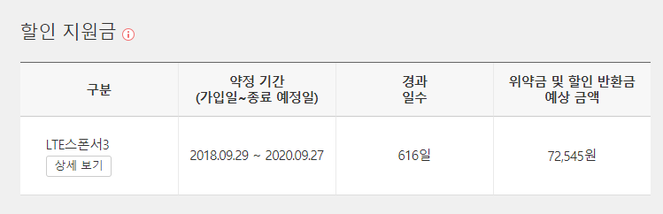 위에 나와있는 조회 버튼을 눌렀을 경우 아래와 같은 현재 계정의 위약금 및 할인 반환금을 확인하실 수 있습니다.