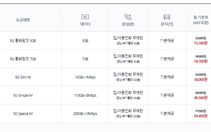 5G 요금제의 경우 5GB를 제공하는 15,300원의 가장 낮은 요금제를 비롯해서 10GB를 제공하는 49,500원 요금제,