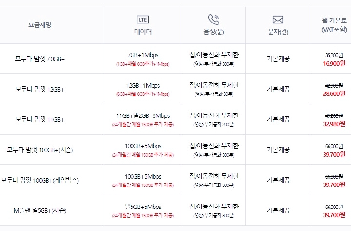 7GB 요금제는 16,900원, 12GB 요금제는 28,600원입니다. 물론, 모두 통화는 무제한으로 제공하고 있습니다.