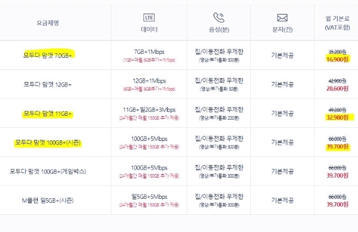 또한, 100GB의 많은 데이터가 필요한 분들이라면, 39,700원의 요금제도 좋을 것 같습니다.