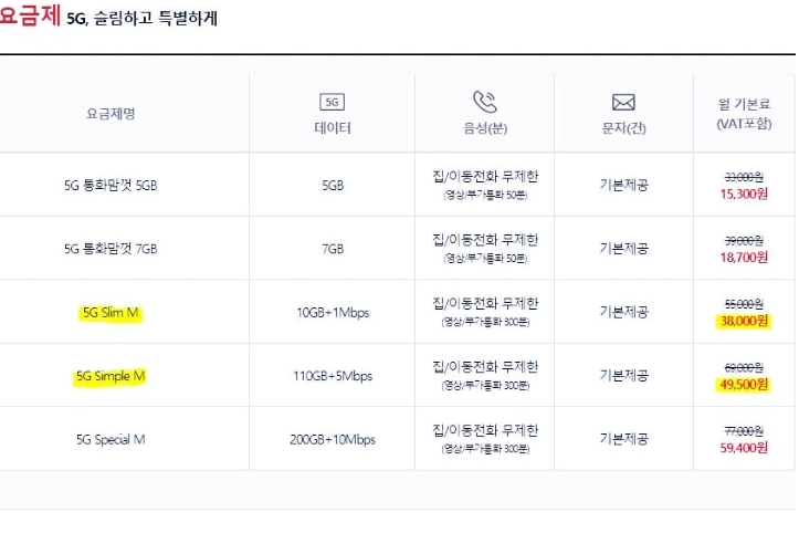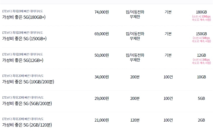 5G 요금제의 경우 12GB를 기본 제공하는 50,000원이며, 150GB를 제공하는 69,000원 요금제 또한, 괜찮습니다.