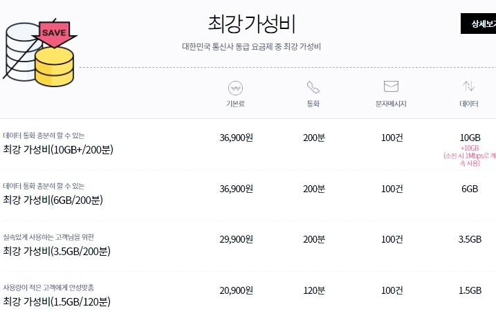 가장 낮은 요금제는 21,000원 요금제도 존재합니다.