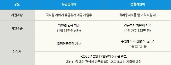 코로나로 인해서 입원 또는 격리 조치가 된 근로자에게 유급 휴가를 부여한 사업주는 유급 휴가 비용을 그 밖에 입원 및 격리 조치자는 생활 지원비에 해당합니다.