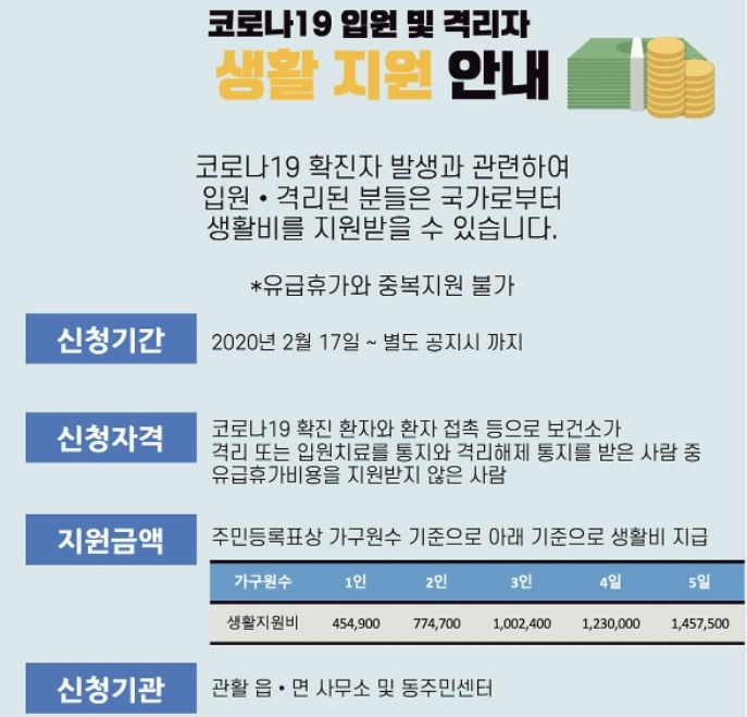 코로나 바이러스로 인해서 입원 및 격리 조치를 받은 분들이 지원받을 수 있는 생활 지원금의 신청 자격도 존재하는데요.