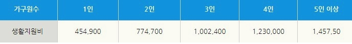 생활 지원비의 자세한 지원 금액은 아래 표를 확인해 주시면 좋을 것 같습니다.
